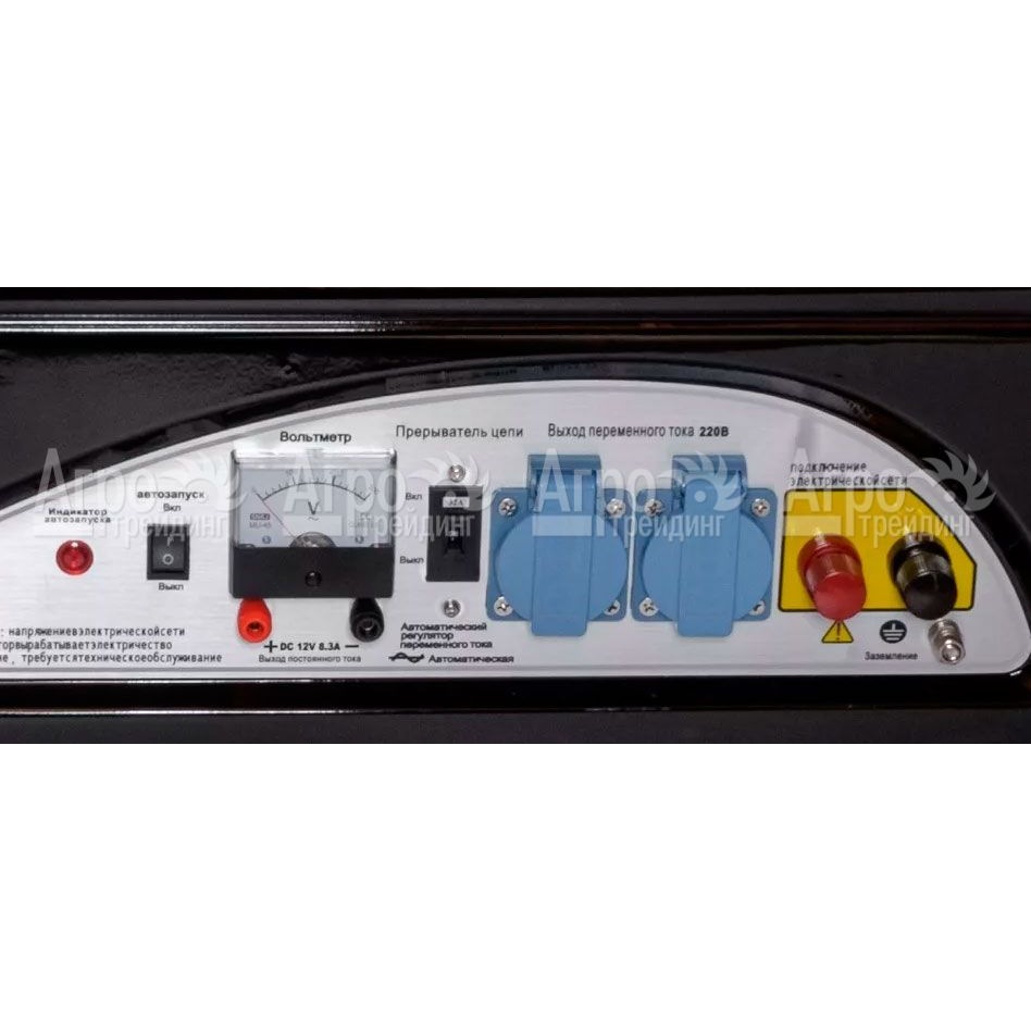 Приборная панель бензинового генератора Lifan 7 GF-5A 7 кВт проста и интуитивно понятна. На ней расположены две однофазные розетки, что позволяет подключать к агрегату сразу несколько потребителей. Контроль за выходным напряжением тока осуществляется встроенным вольтметром. Дополнительно на приборной панели имеется индикатор уровня топлива и датчик уровня масла.